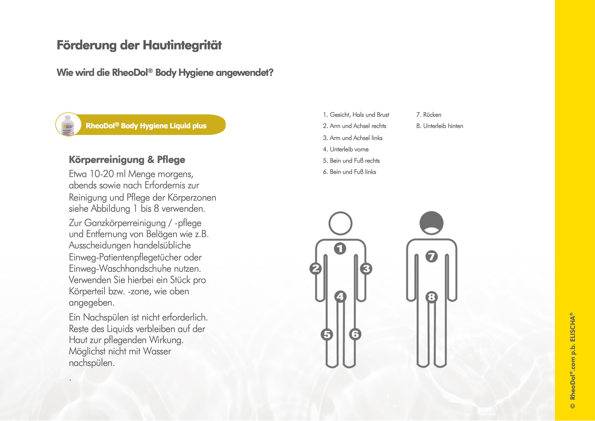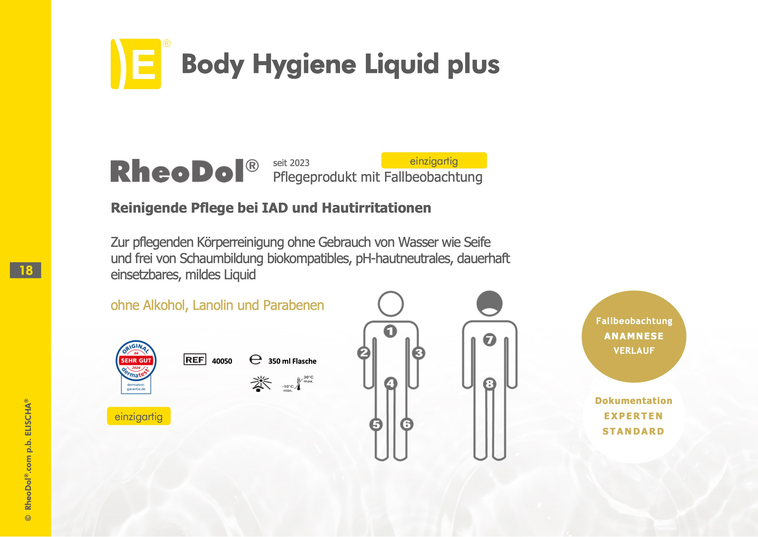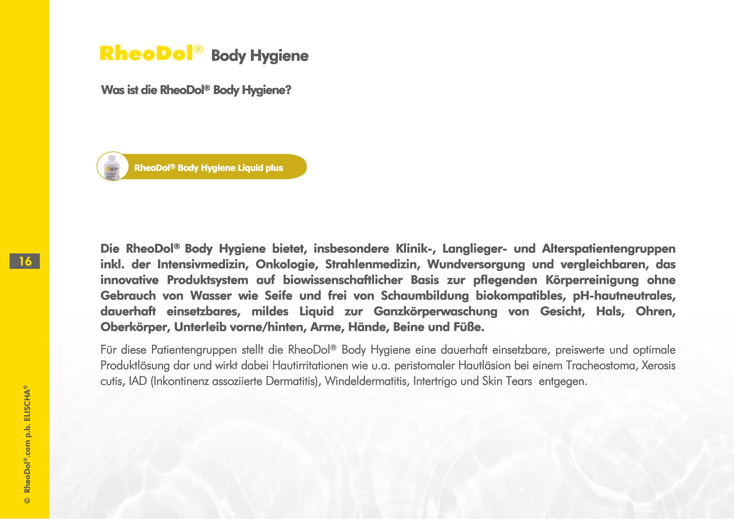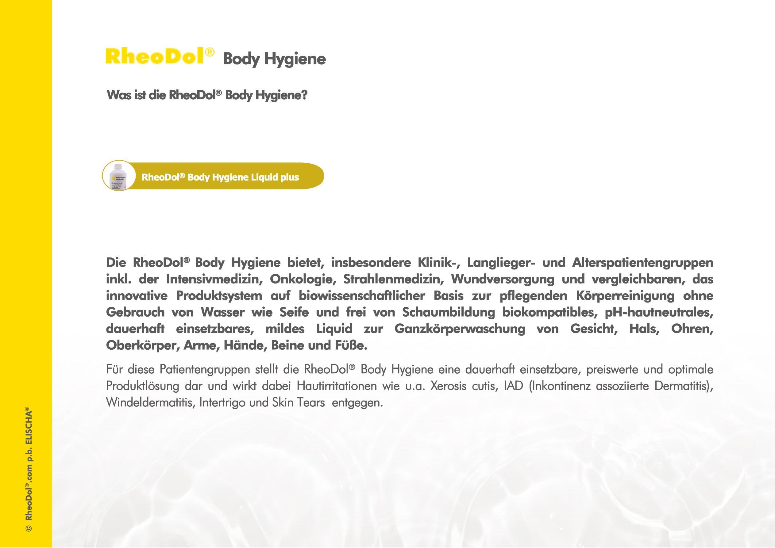 Die RheoDol® Body Hygiene bietet, insbesondere Klinik,- Langlieger- und Alterspatientengruppen inkl. der Intensivmedizin, Onkologie, Strahlenmedizin, Wundversorgung und vergleichbaren, das innovative Produktsystem auf biowissenschaftlicher Basis zur pflegenden Körperreinigung ohne Gebrauch von Wasser wie Seife und frei von Schaumbildung biokompatibles, pH-hautneutrales, dauerhaft einsetzbares, mildes Liquid zur Ganzkörperwaschung von Gesicht, Hals, Ohren, Oberkörper, Arme, Hände, Beine und Füße.