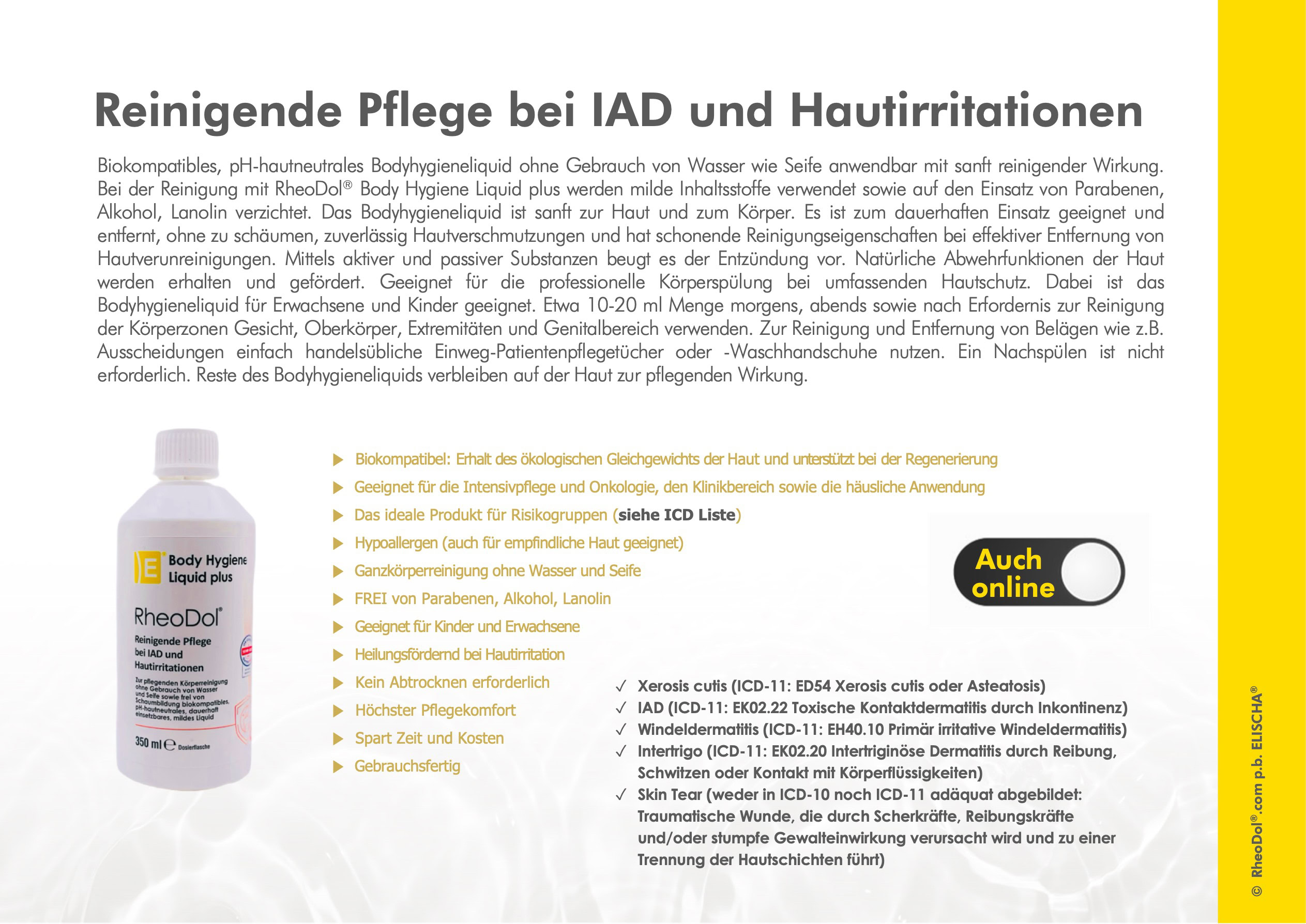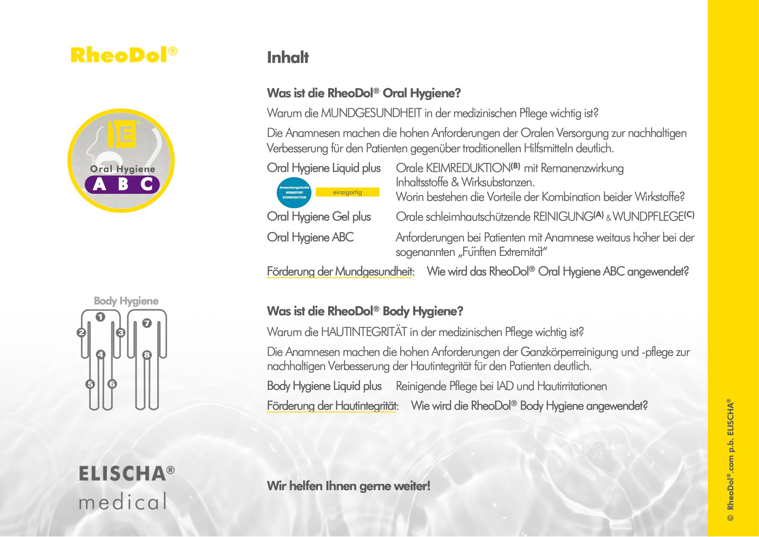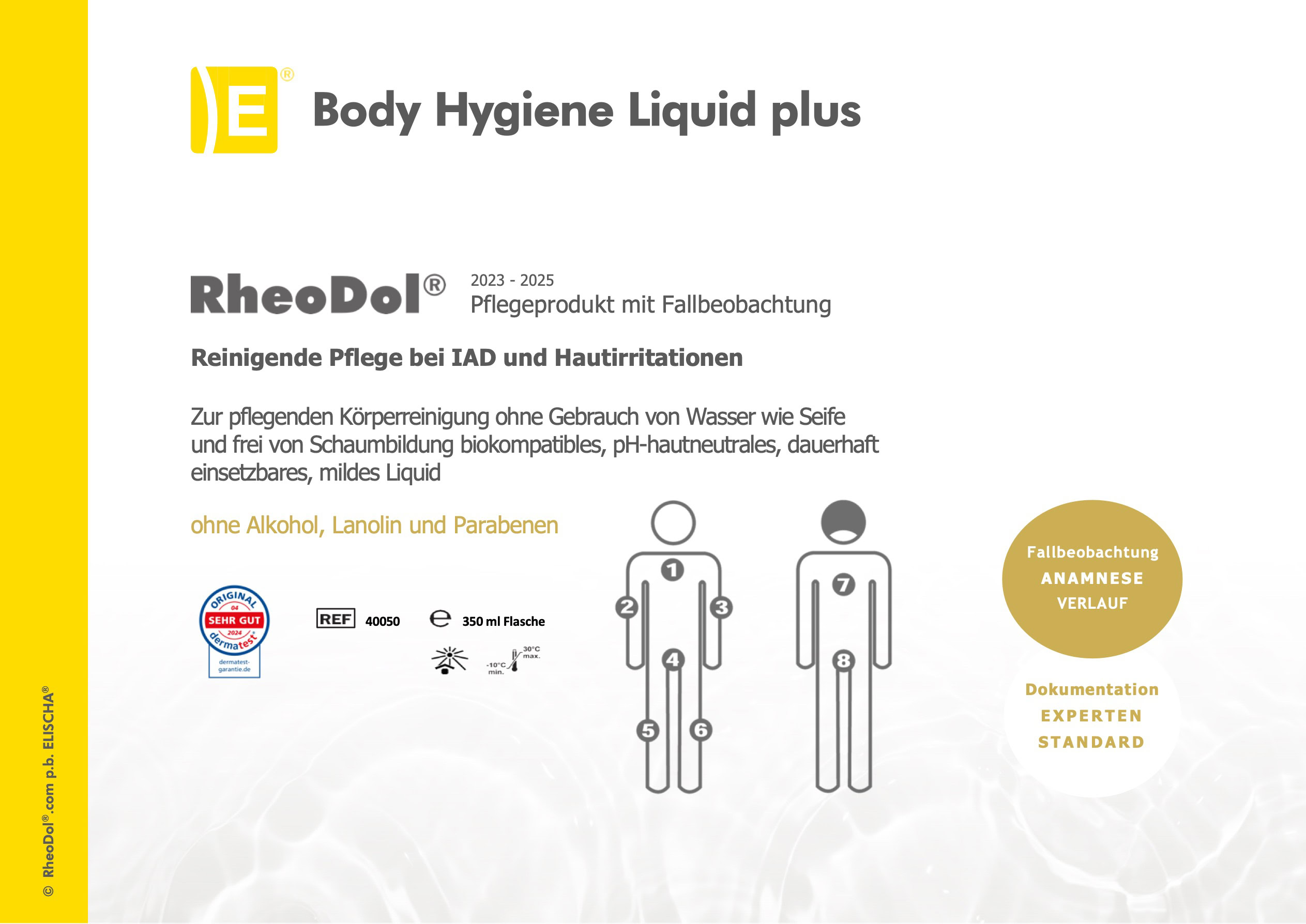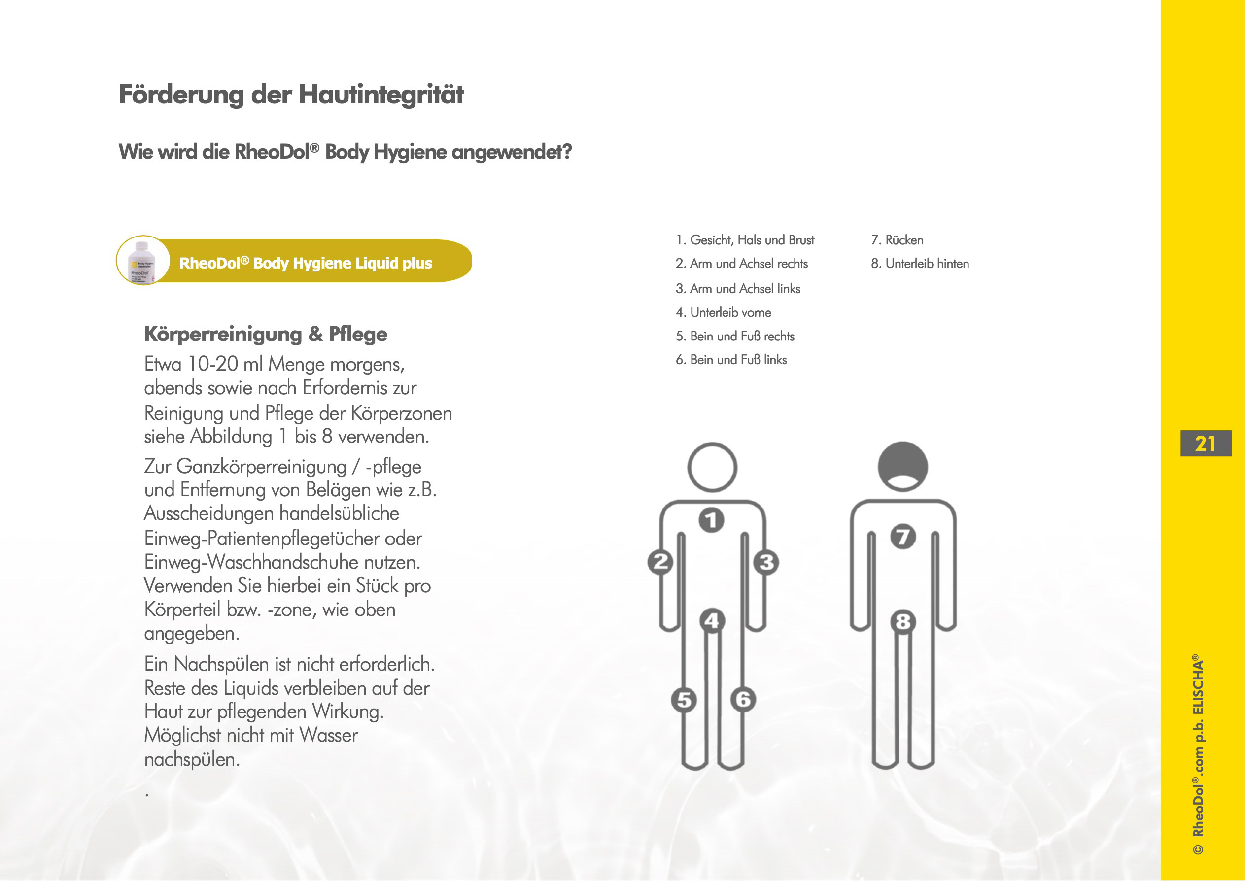 Die RheoDol® Body Hygiene bietet, insbesondere Klinik,- Langlieger- und Alterspatientengruppen inkl. der Intensivmedizin, Onkologie, Strahlenmedizin, Wundversorgung und vergleichbaren, das innovative Produktsystem auf biowissenschaftlicher Basis zur pflegenden Körperreinigung ohne Gebrauch von Wasser wie Seife und frei von Schaumbildung biokompatibles, pH-hautneutrales, dauerhaft einsetzbares, mildes Liquid zur Ganzkörperwaschung von Gesicht, Hals, Ohren, Oberkörper, Arme, Hände, Beine und Füße.