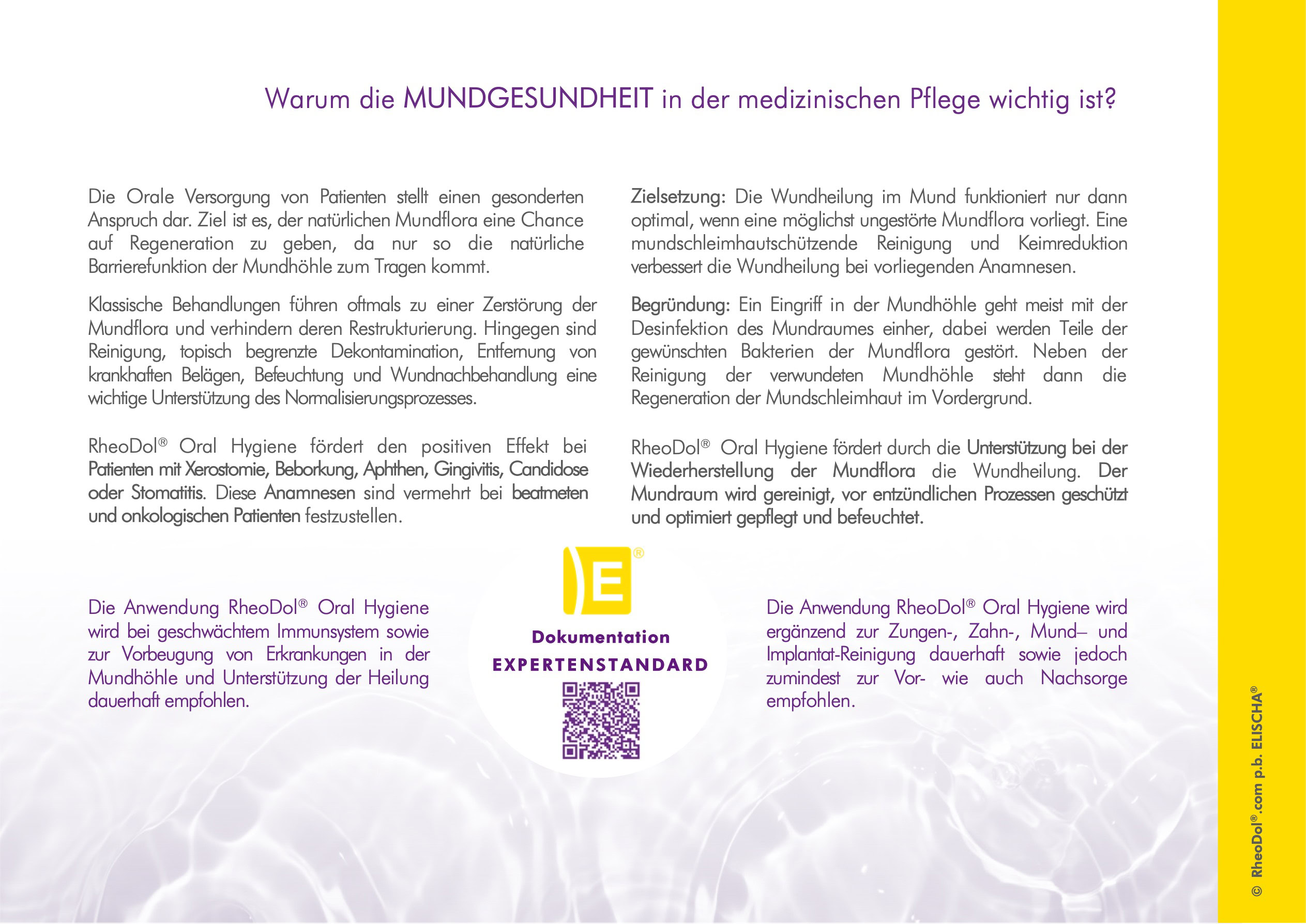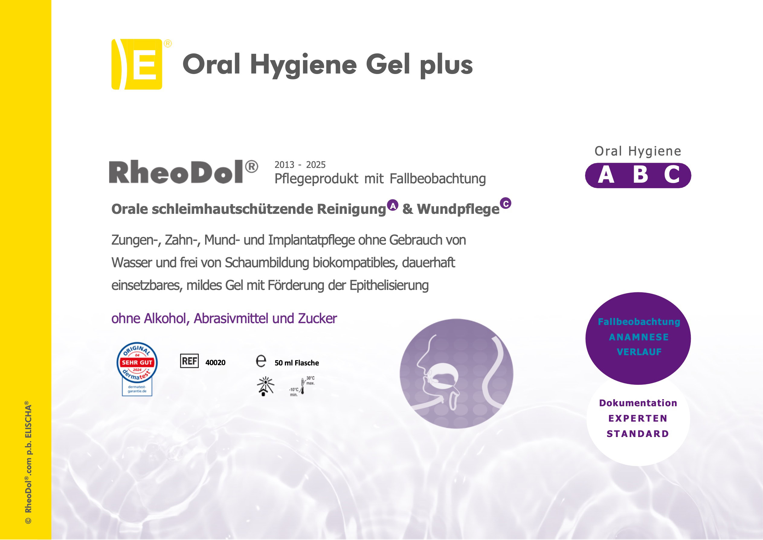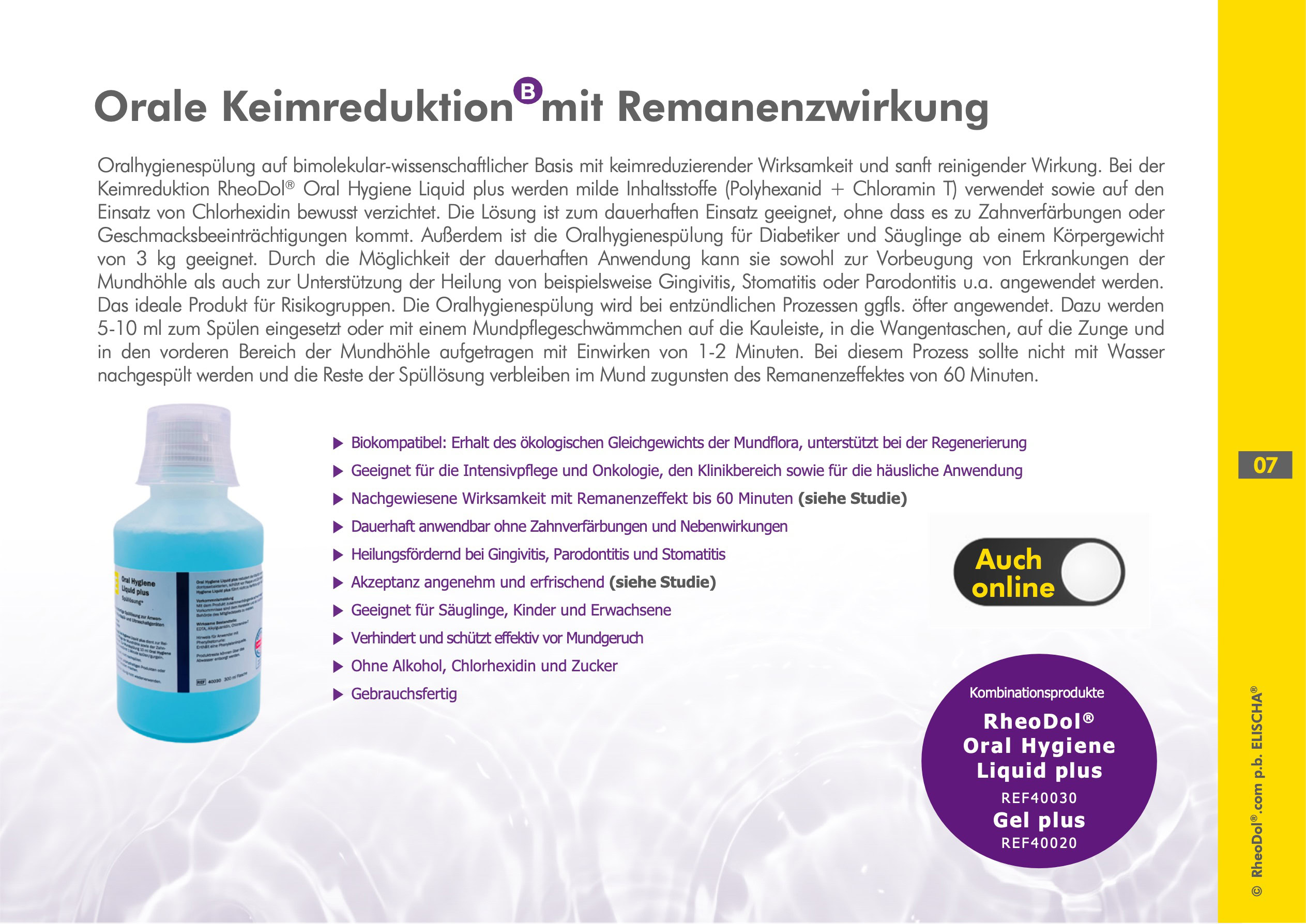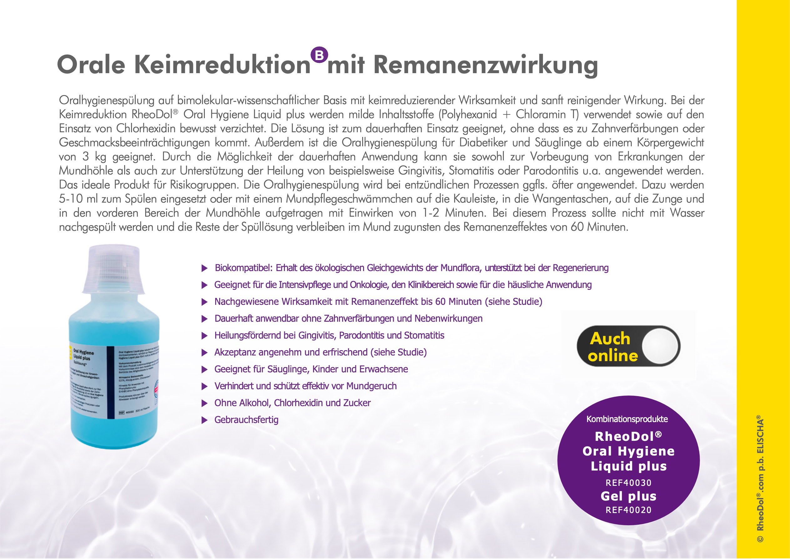 Begründung: Ein Eingriff in der Mundhöhle geht meist mit der Desinfektion des Mundraumes einher, dabei werden Teile der gewünschten Bakterien der Mundflora gestört. Neben der Reinigung der verwundeten Mundhöhle steht dann die Regeneration der Mundschleimhaut im Vordergrund. RheoDol® Oral Hygiene fördert durch die Unterstützung bei der Wiederherstellung der Mundflora die Wundheilung. Der Mundraum wird gereinigt, vor entzündlichen Prozessen geschützt und optimiert gepflegt und befeuchtet.