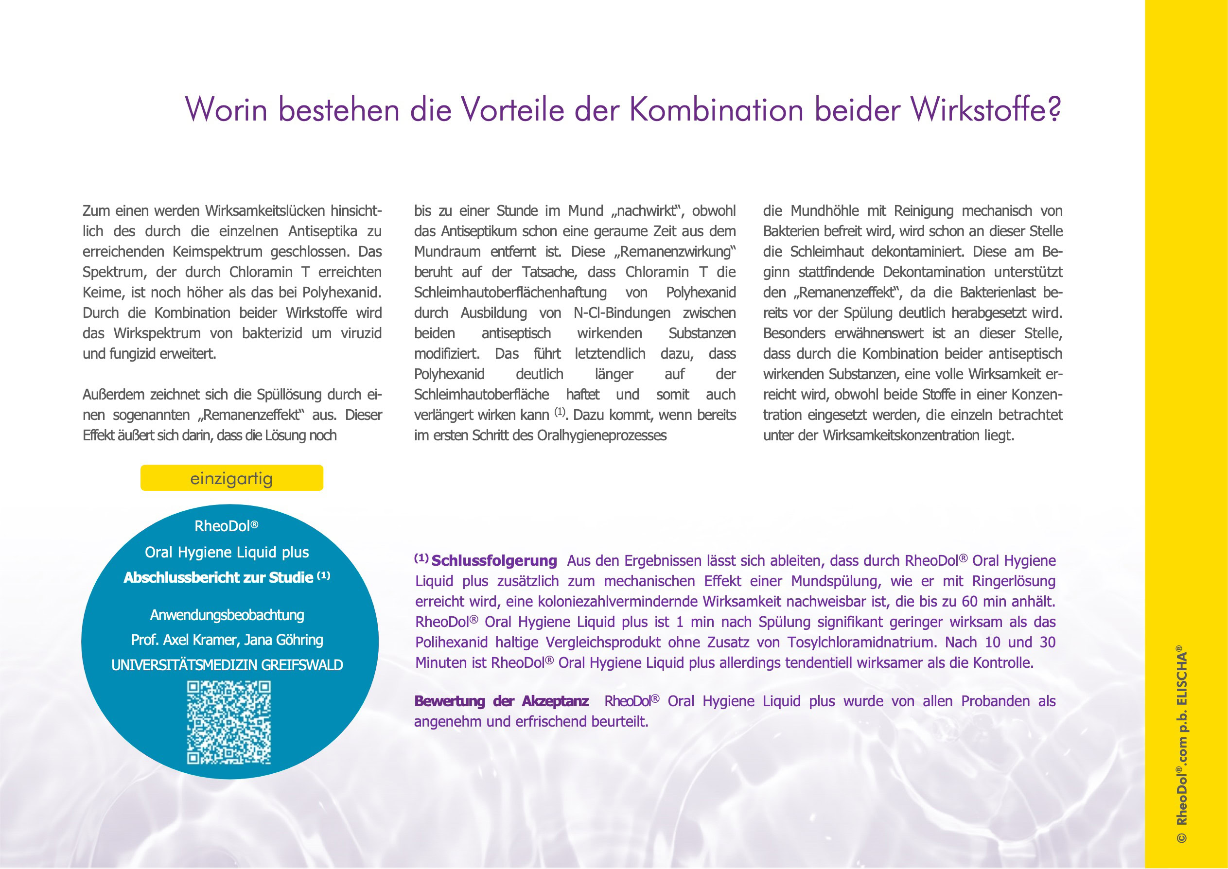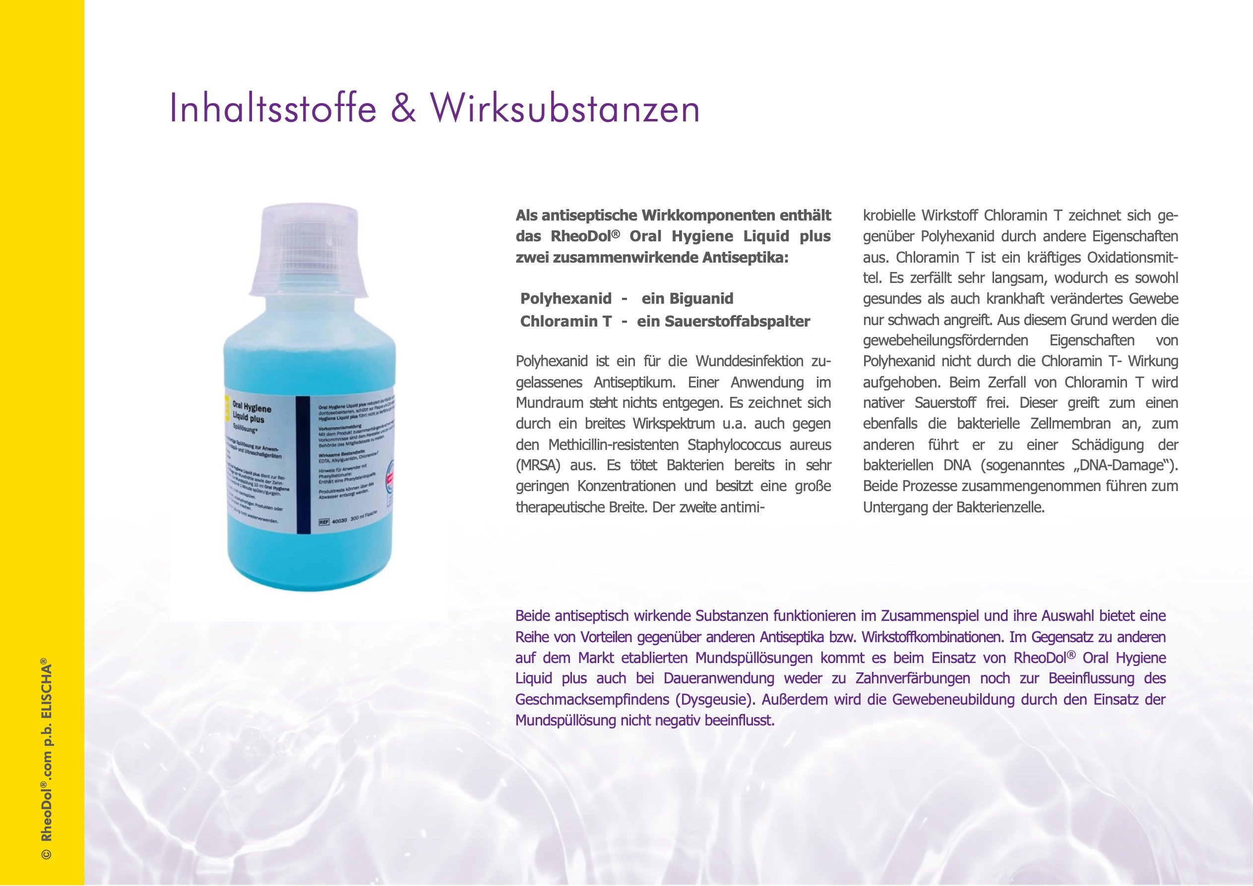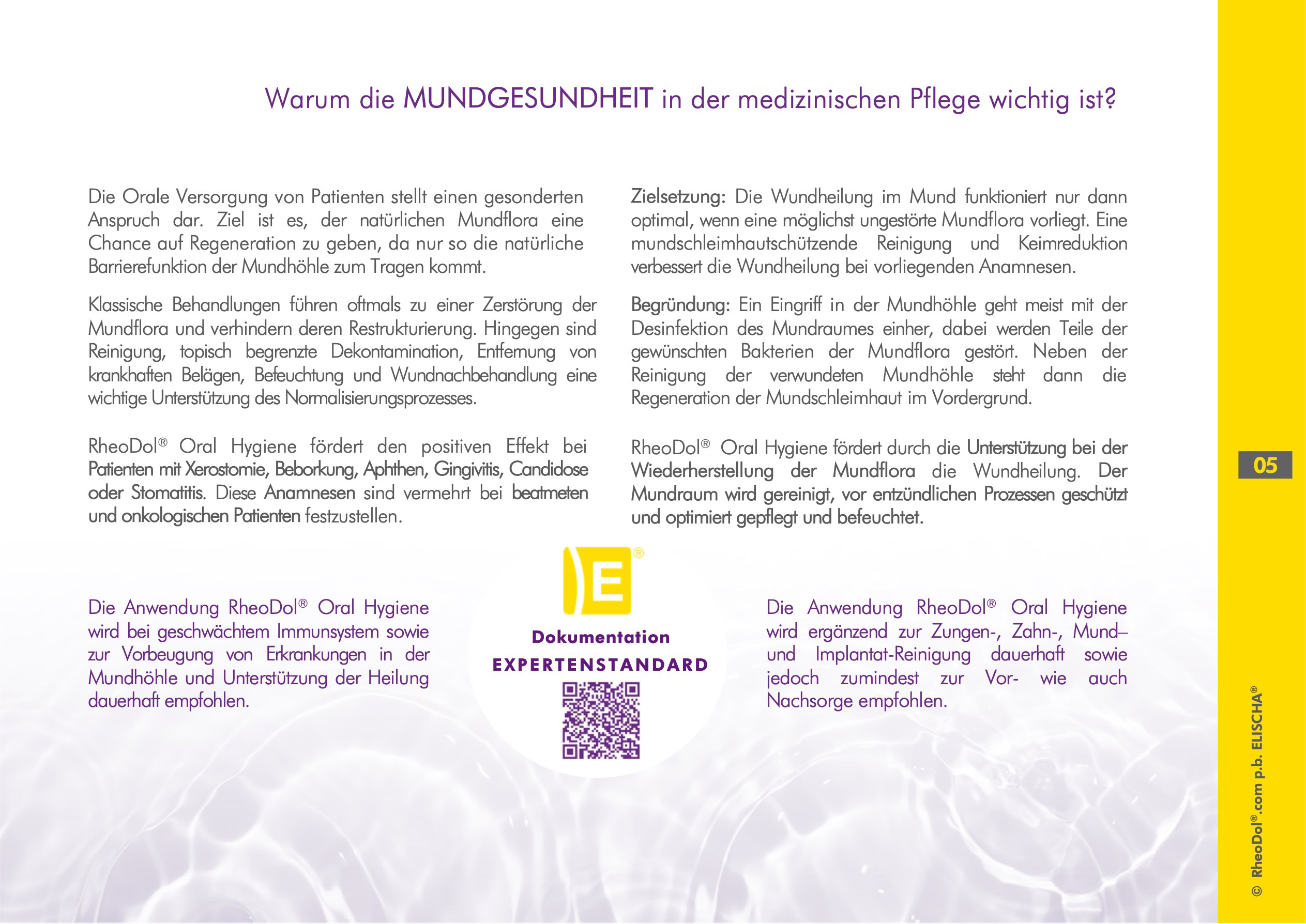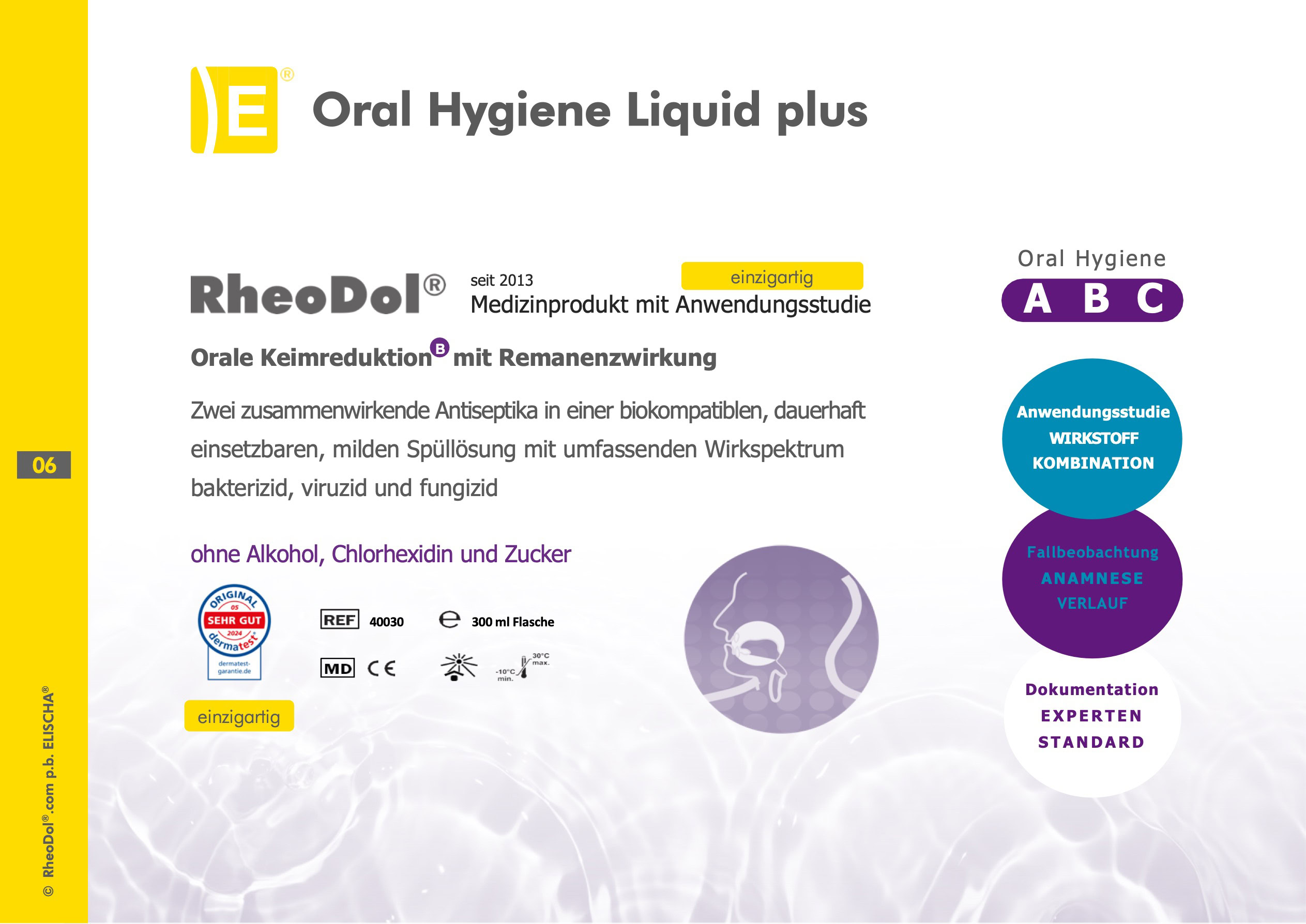Begründung: Ein Eingriff in der Mundhöhle geht meist mit der Desinfektion des Mundraumes einher, dabei werden Teile der gewünschten Bakterien der Mundflora gestört. Neben der Reinigung der verwundeten Mundhöhle steht dann die Regeneration der Mundschleimhaut im Vordergrund. RheoDol® Oral Hygiene fördert durch die Unterstützung bei der Wiederherstellung der Mundflora die Wundheilung. Der Mundraum wird gereinigt, vor entzündlichen Prozessen geschützt und optimiert gepflegt und befeuchtet.