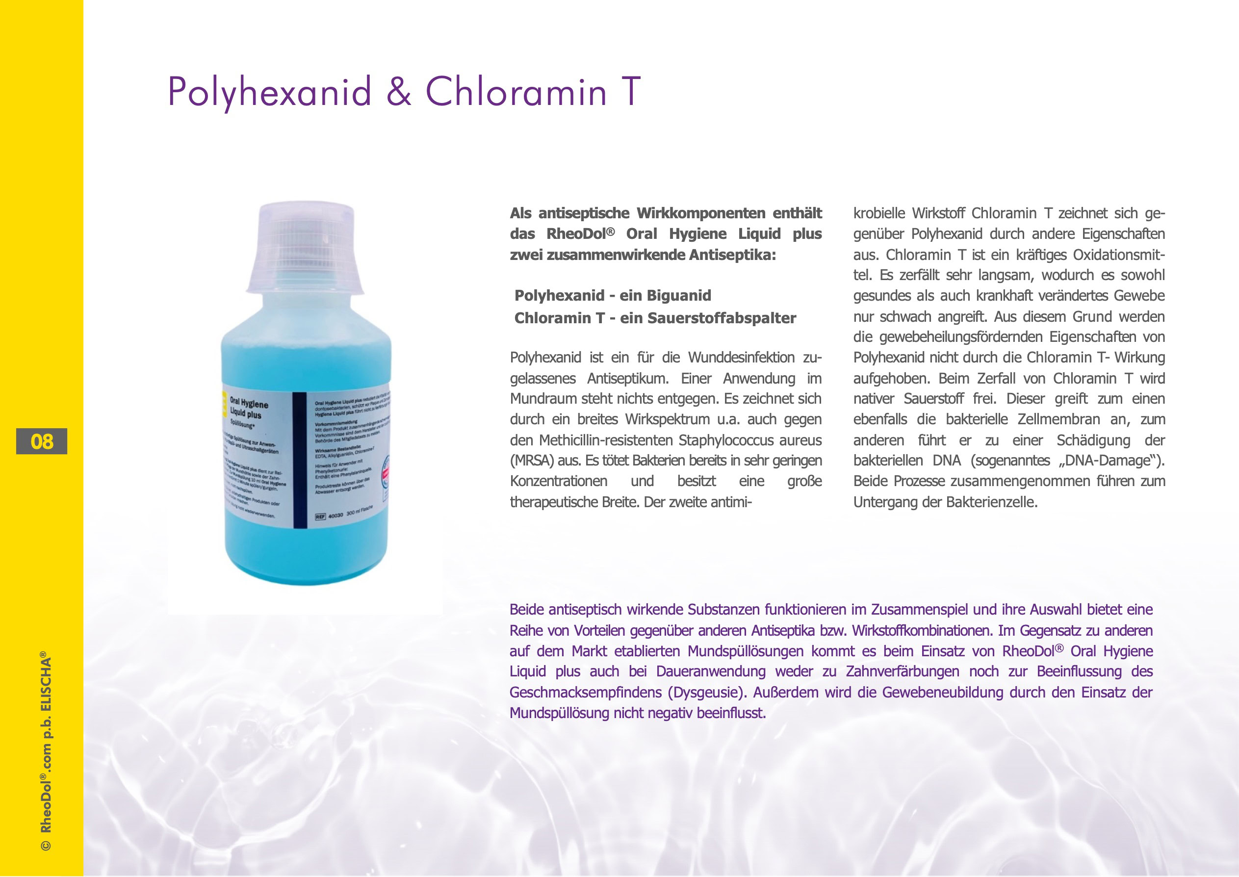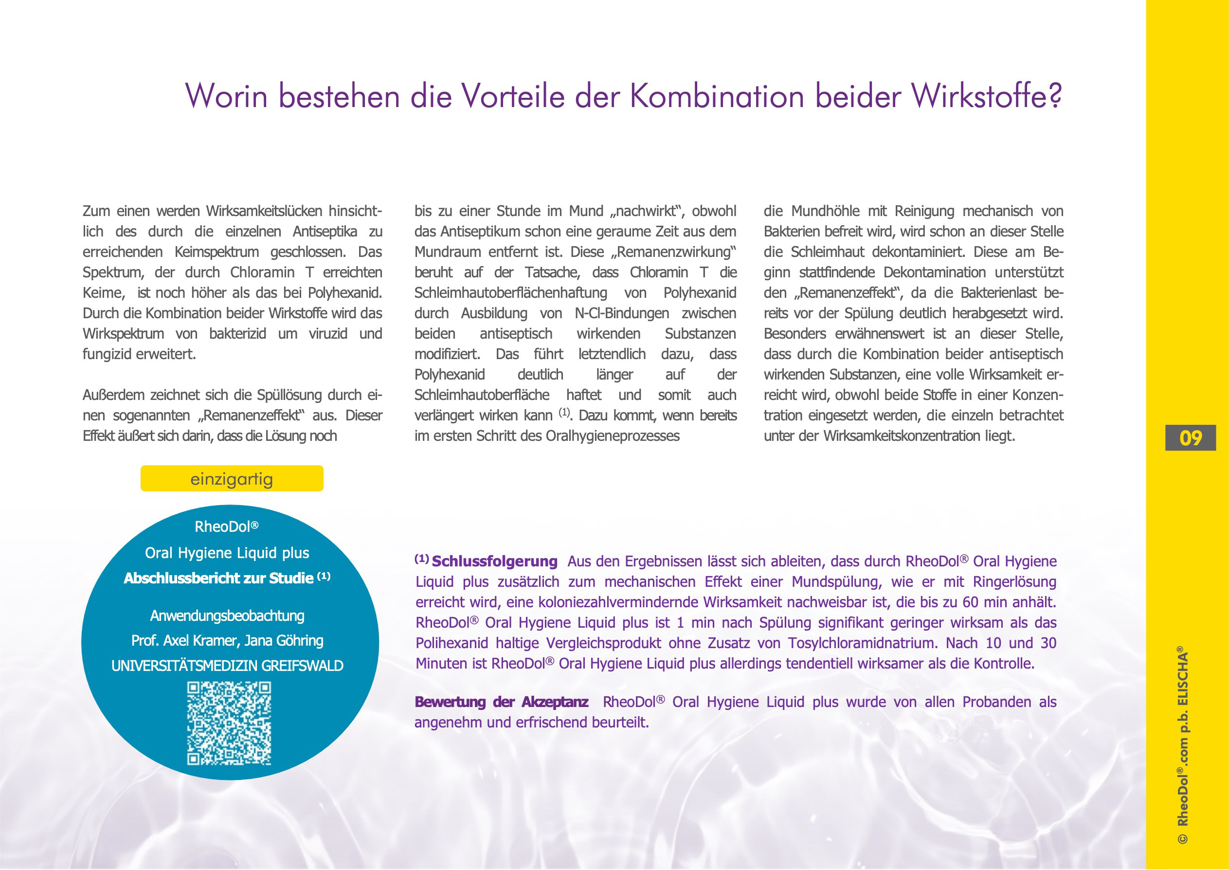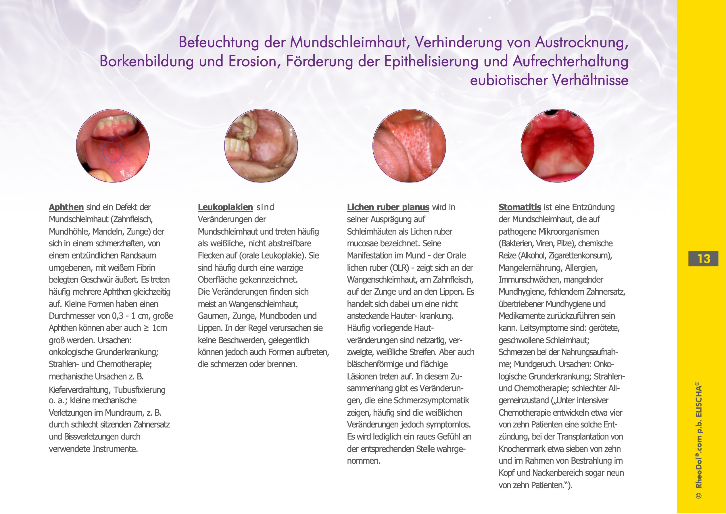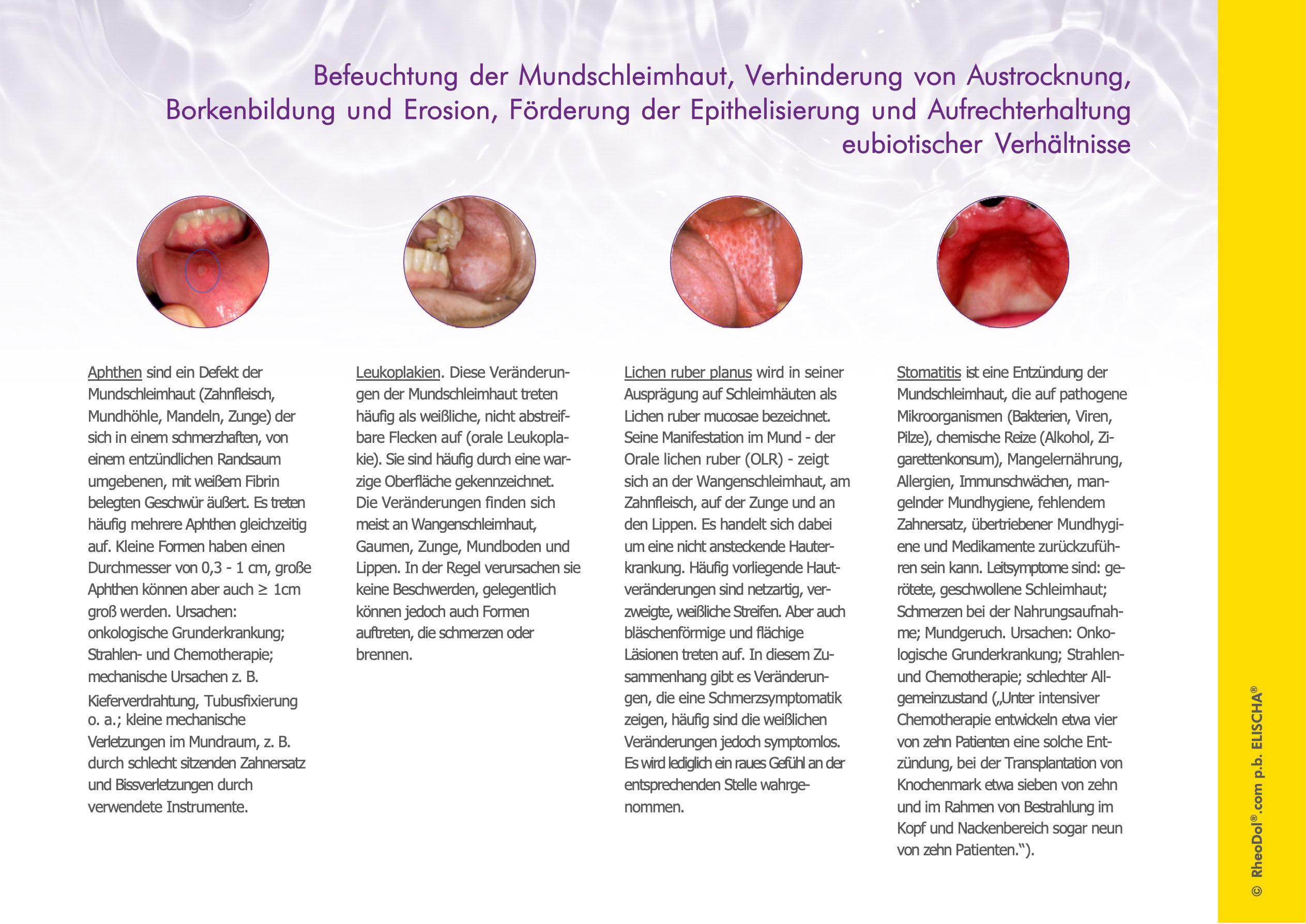 Begründung: Ein Eingriff in der Mundhöhle geht meist mit der Desinfektion des Mundraumes einher, dabei werden Teile der gewünschten Bakterien der Mundflora gestört. Neben der Reinigung der verwundeten Mundhöhle steht dann die Regeneration der Mundschleimhaut im Vordergrund. RheoDol® Oral Hygiene fördert durch die Unterstützung bei der Wiederherstellung der Mundflora die Wundheilung. Der Mundraum wird gereinigt, vor entzündlichen Prozessen geschützt und optimiert gepflegt und befeuchtet.