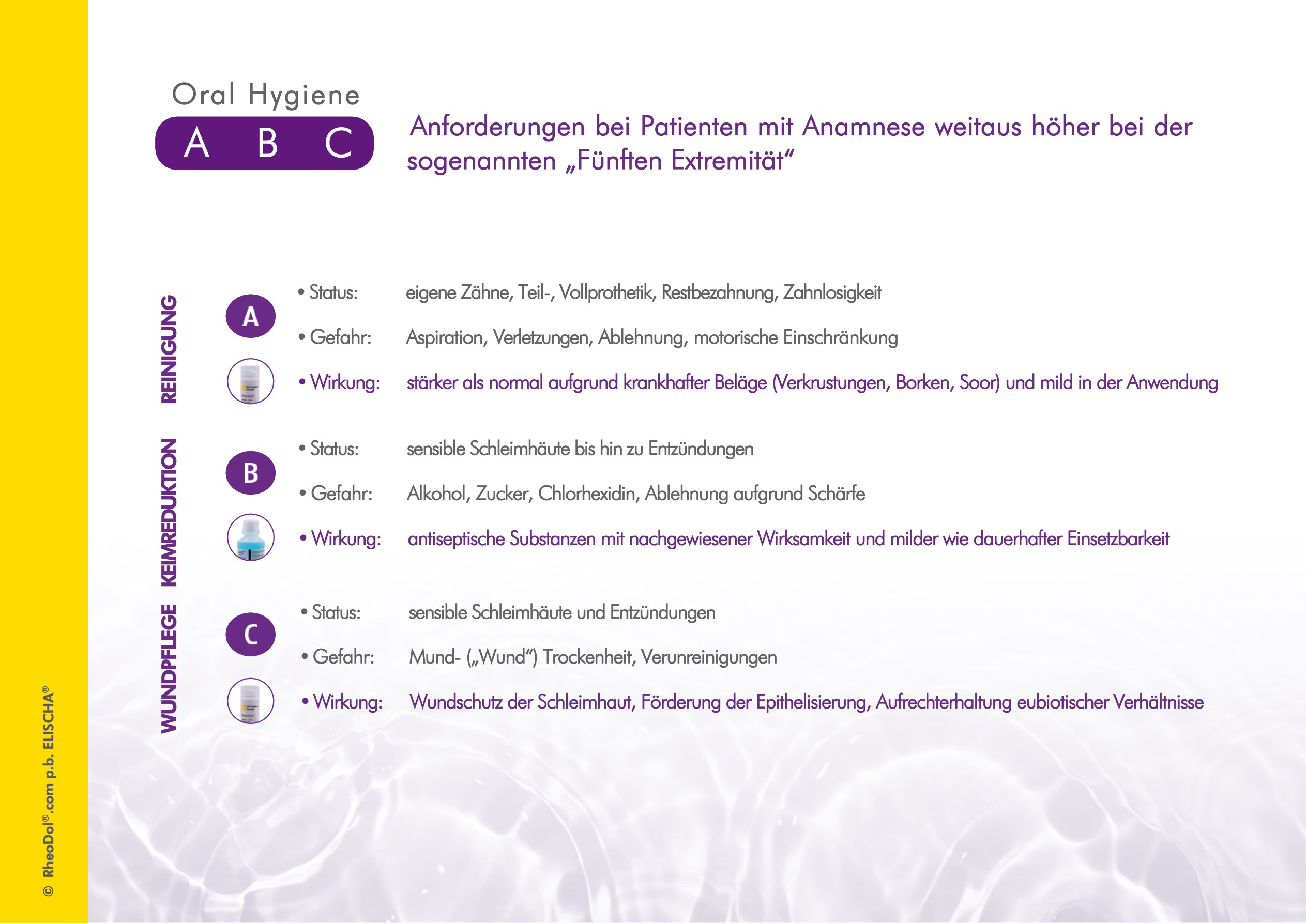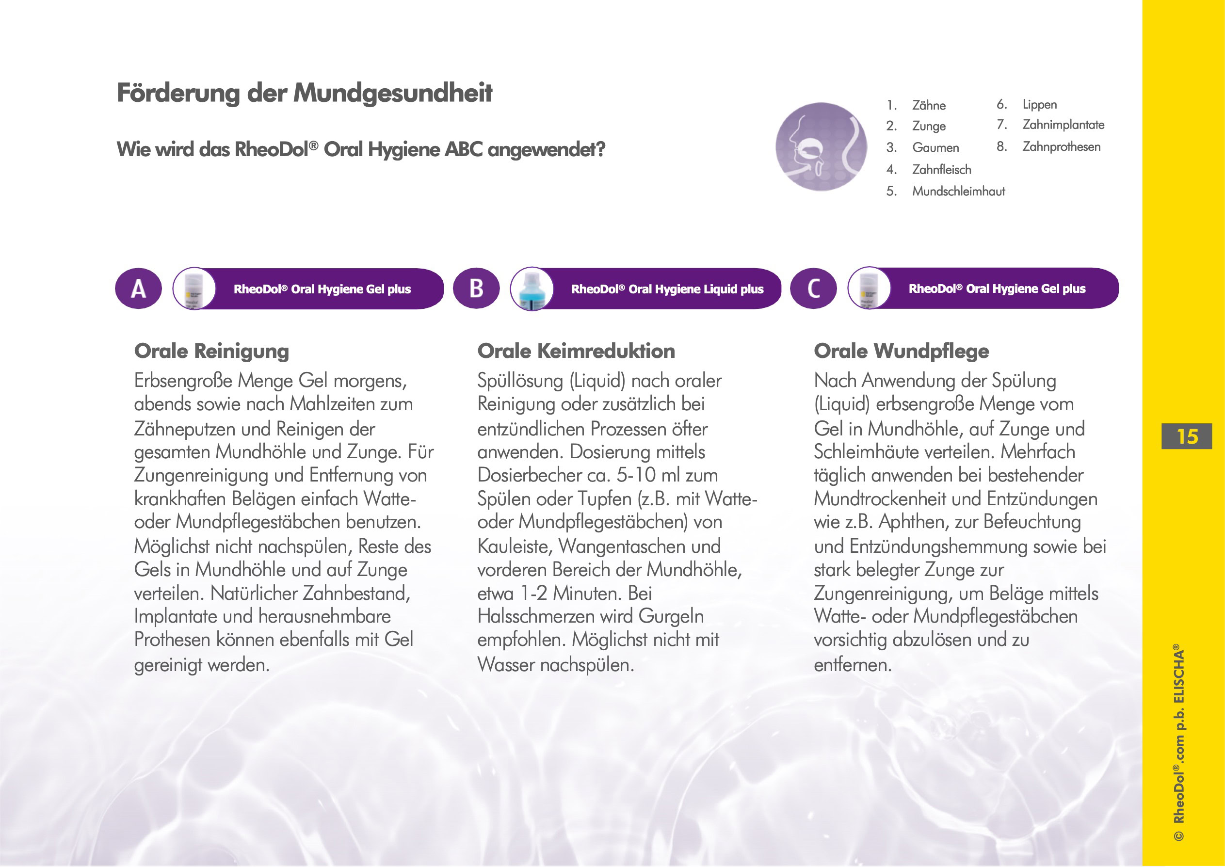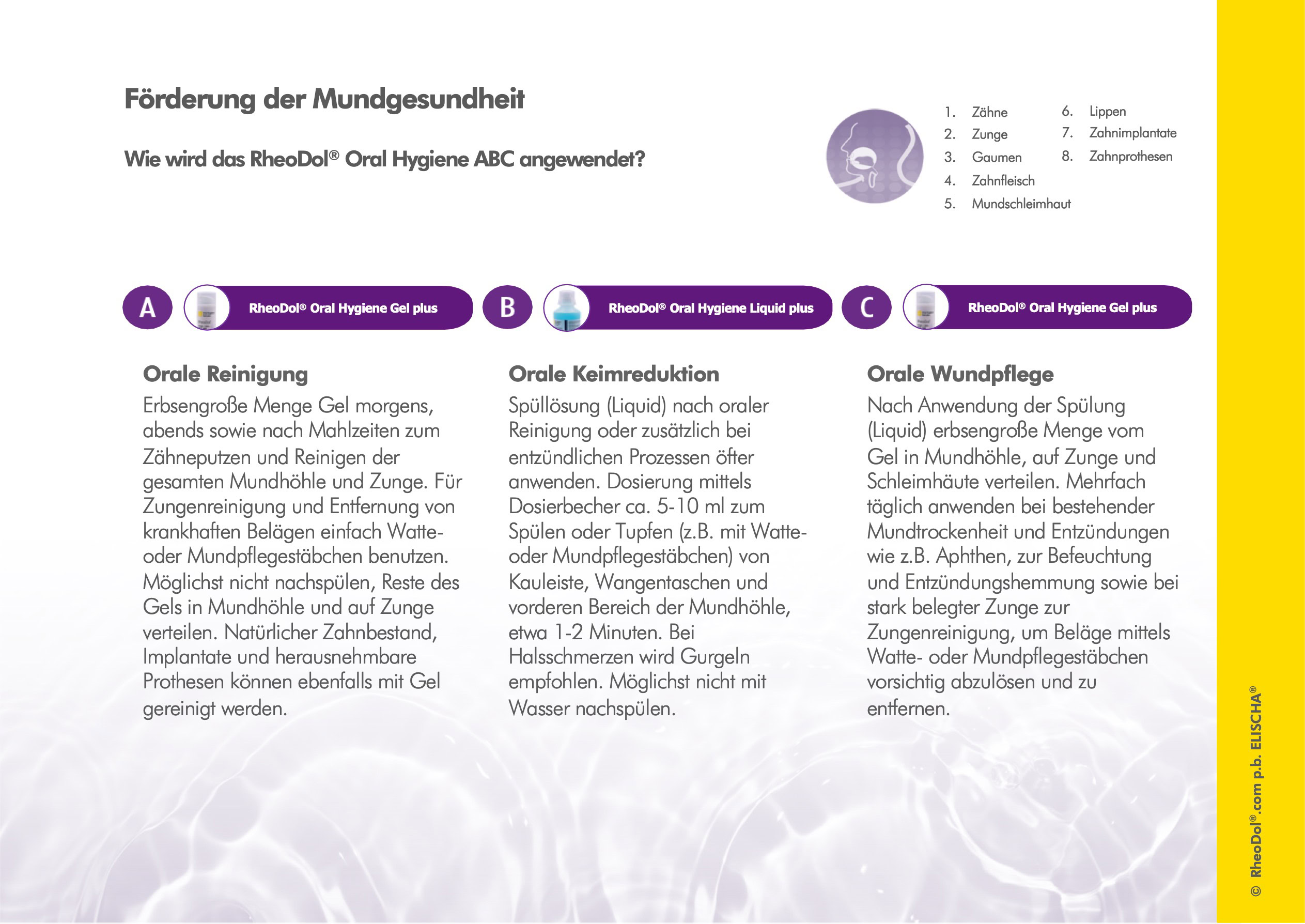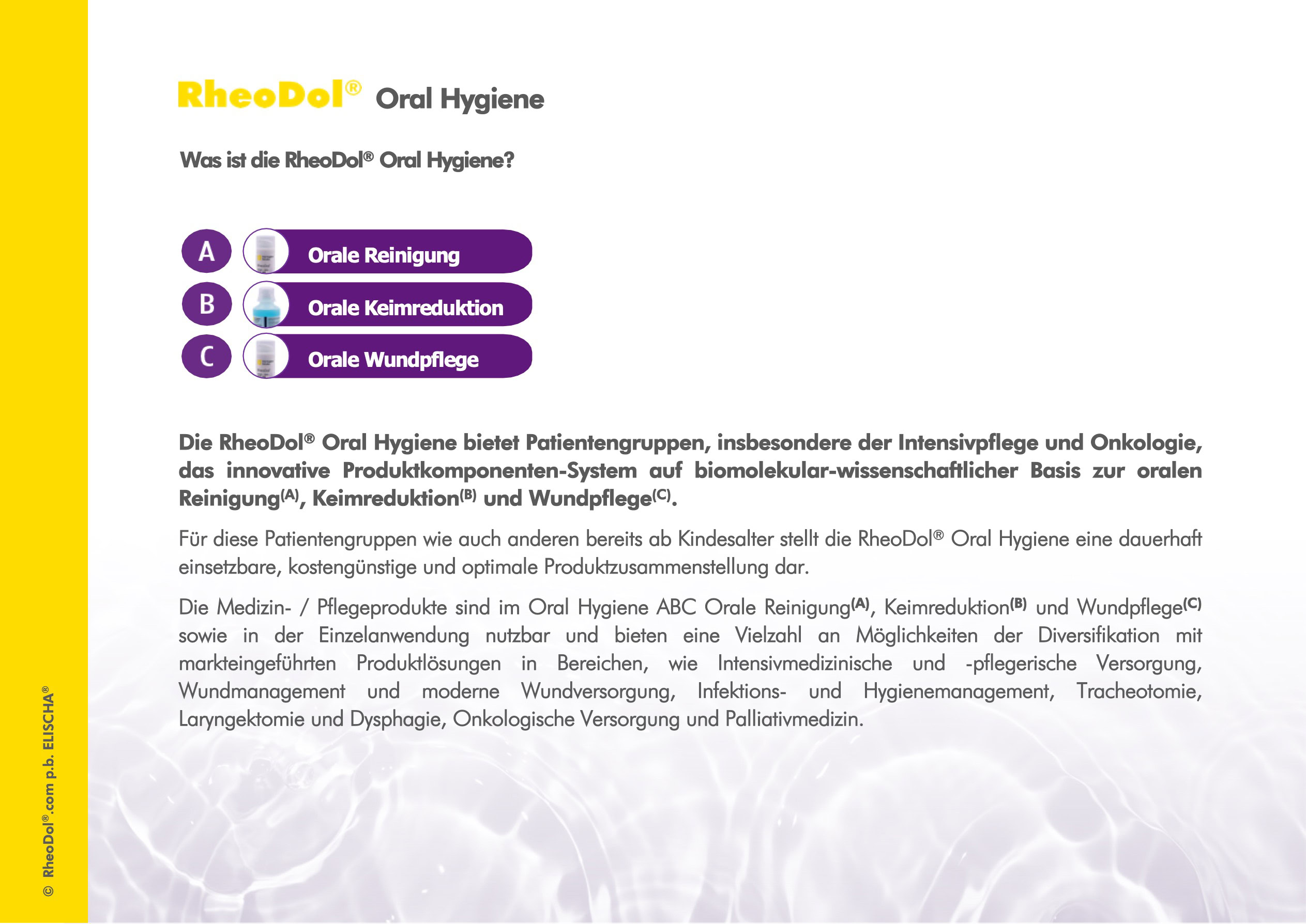 Die RheoDol® Oral Hygiene bietet Patientengruppen, insbesondere der Intensivpflege und Onkologie, das innovative Produktkomponenten-System auf biomolekular-wissenschaftlicher Basis zur oralen Reinigung(A), Keimreduktion(B)und Wundpflege(C). Für diese Patientengruppen wie auch anderen bereits ab Kindesalter stellt die RheoDol®Oral Hygiene eine dauerhaft einsetzbare, kostengünstige und optimale Produktzusammenstellung dar.