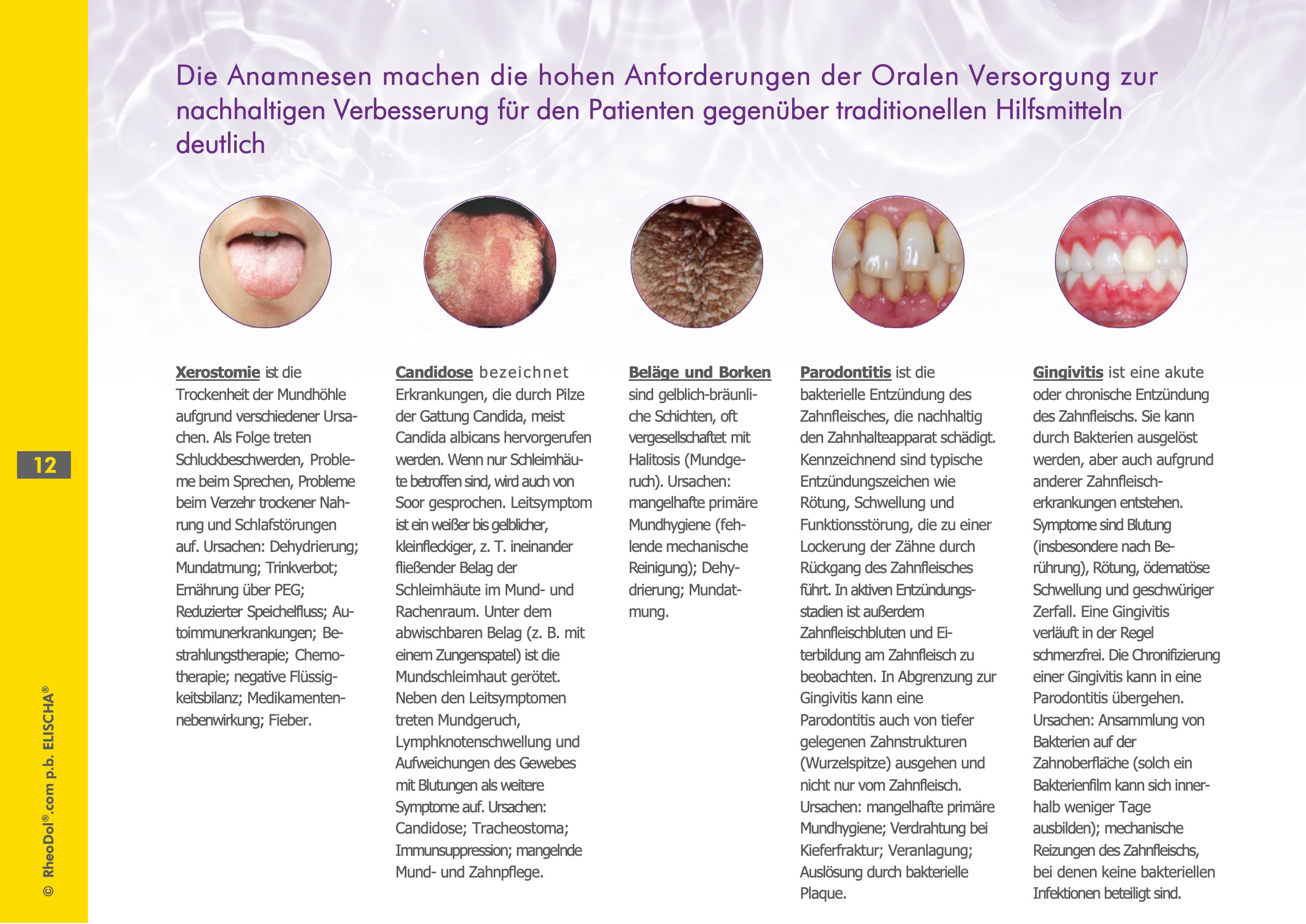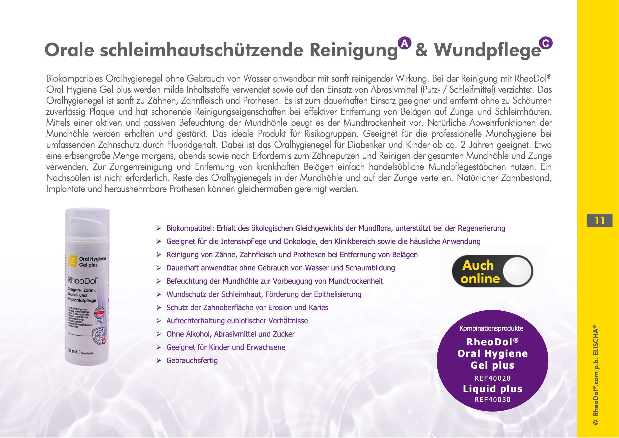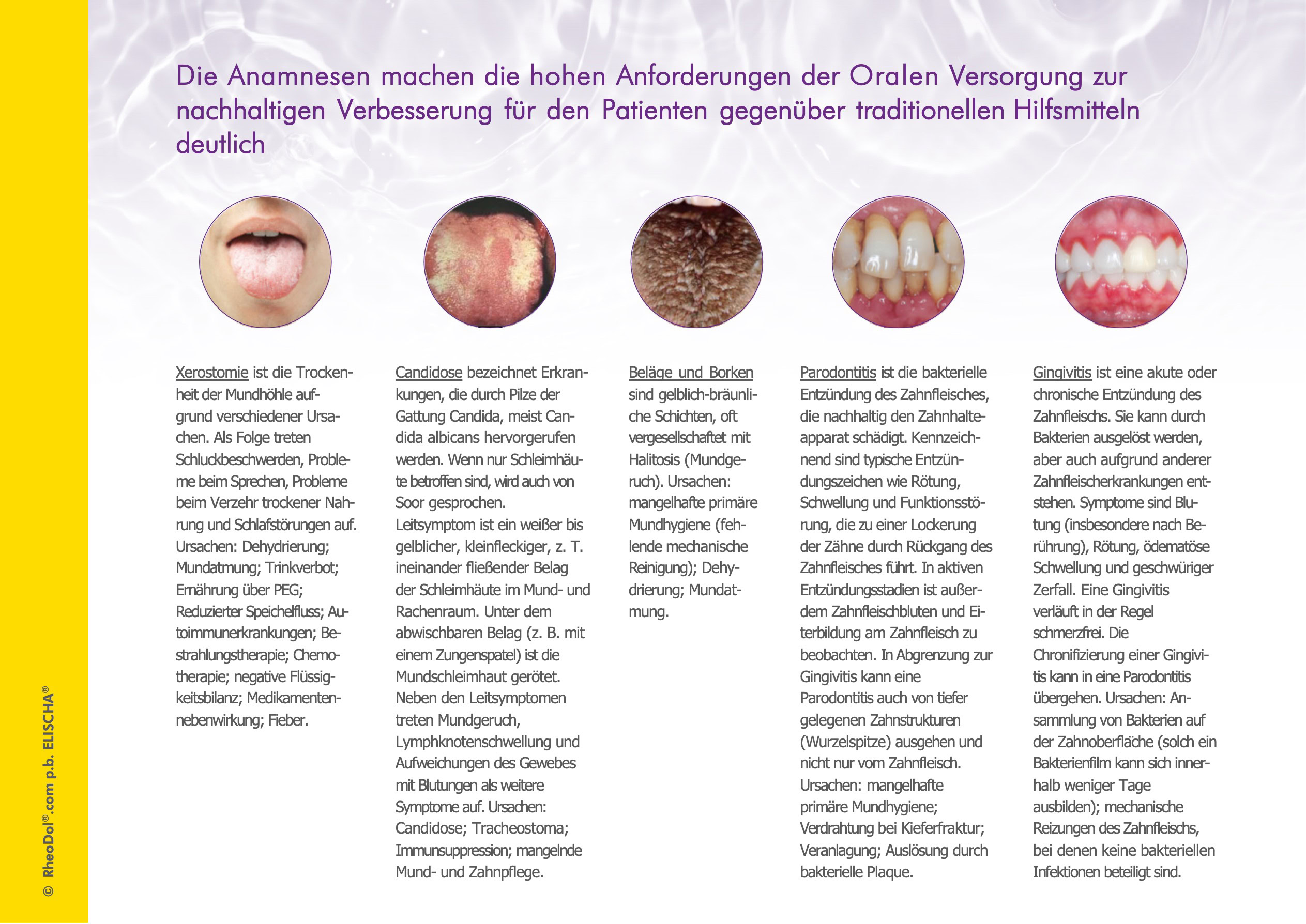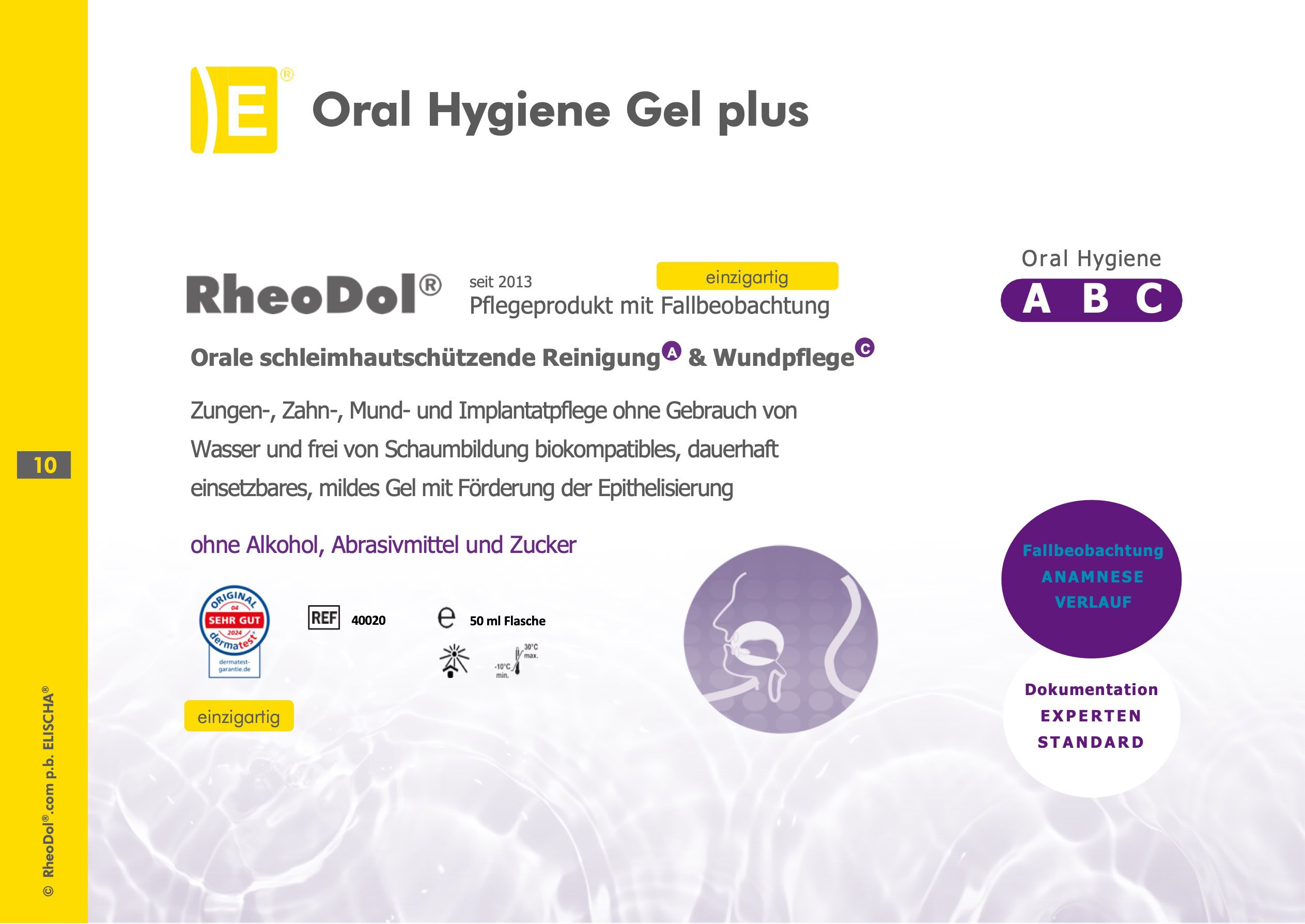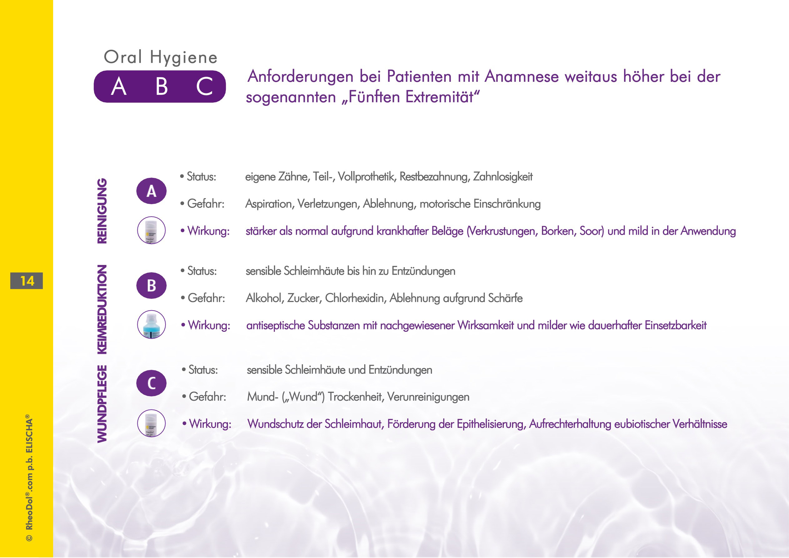 Die RheoDol® Oral Hygiene bietet Patientengruppen, insbesondere der Intensivpflege und Onkologie, das innovative Produktkomponenten-System auf biomolekular-wissenschaftlicher Basis zur oralen Reinigung(A), Keimreduktion(B)und Wundpflege(C). Für diese Patientengruppen wie auch anderen bereits ab Kindesalter stellt die RheoDol®Oral Hygiene eine dauerhaft einsetzbare, kostengünstige und optimale Produktzusammenstellung dar.