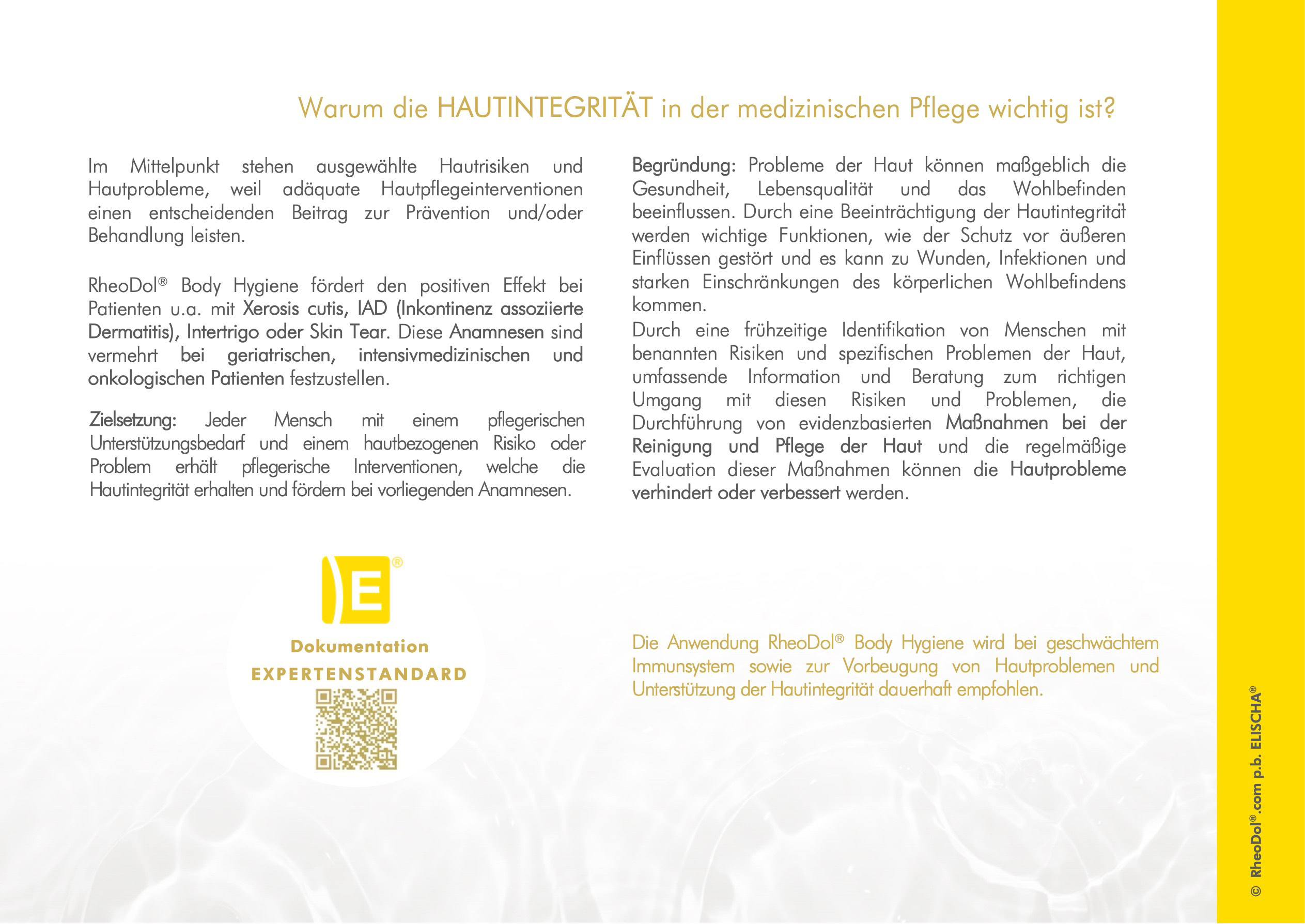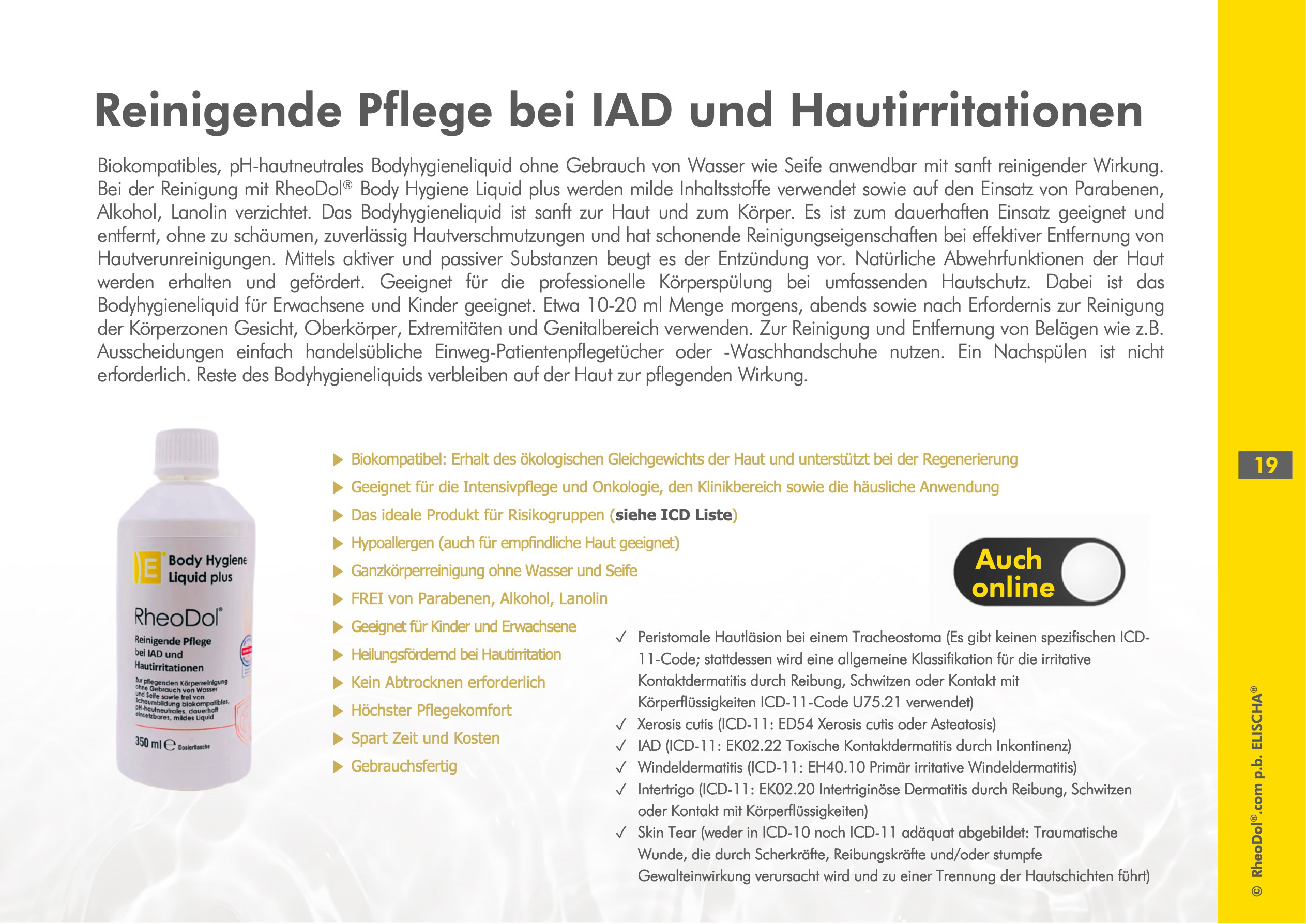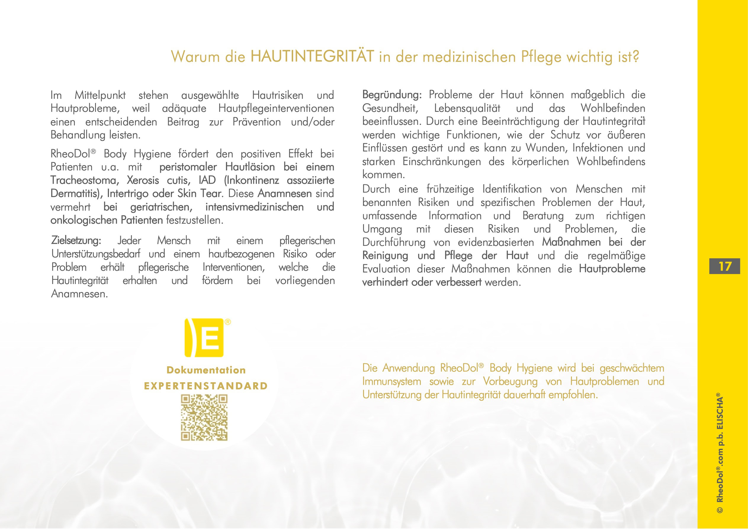 Für diese Patientengruppen stellt die RheoDol® Body Hygiene eine dauerhaft einsetzbare, preiswerte und optimale Produktlösung dar und wirkt dabei Hautirritationen wie u.a. peristomaler Hautläsion bei einem Tracheostoma, Xerosis cutis, IAD (Inkontinenz assoziierte Dermatitis), Windeldermatitis, Intertrigo und Skin Tears entgegen.