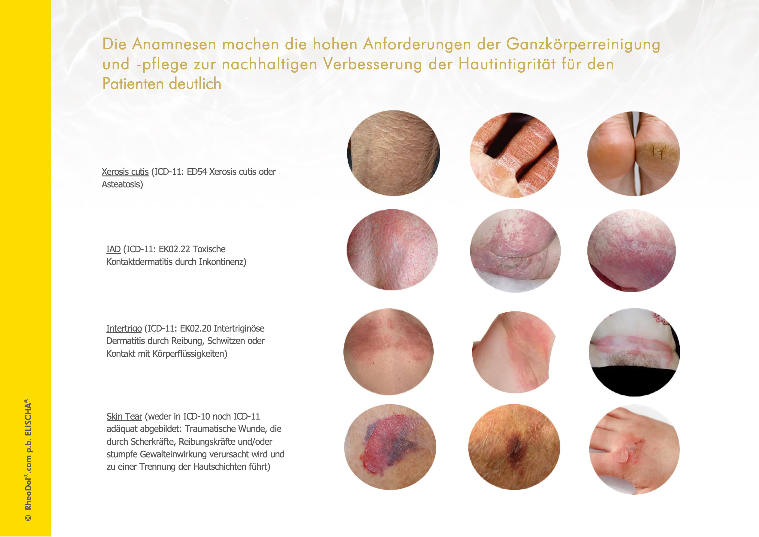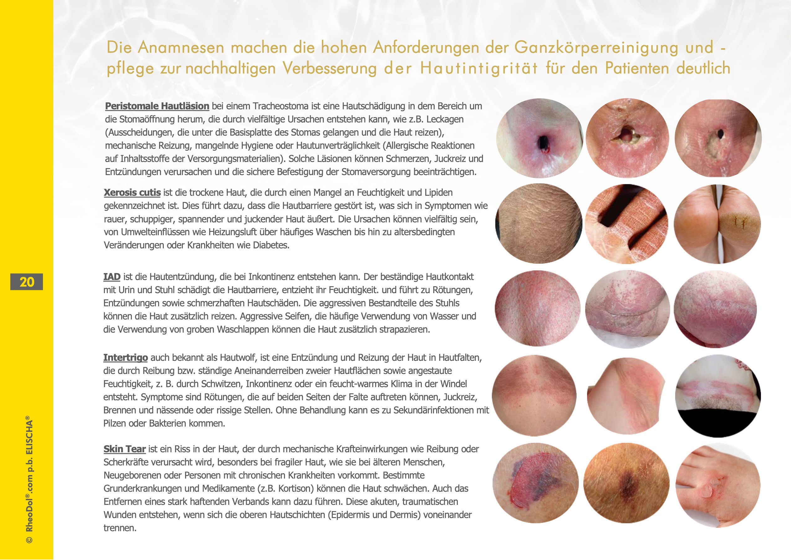 RheoDol® Body Hygiene fördert den positiven Effekt bei Patienten mit peristomaler Hautläsion bei einem Tracheostoma, Xerosis cutis (trockene Haut), IAD (Inkontinenz assoziierte Dermatitis), Intertrigo oder Skin Tears („Pergamenthaut“. Diese Anamnesen sind vermehrt bei geriatrischen, intensivmedizinischen und onkologischen Patienten festzustellen.